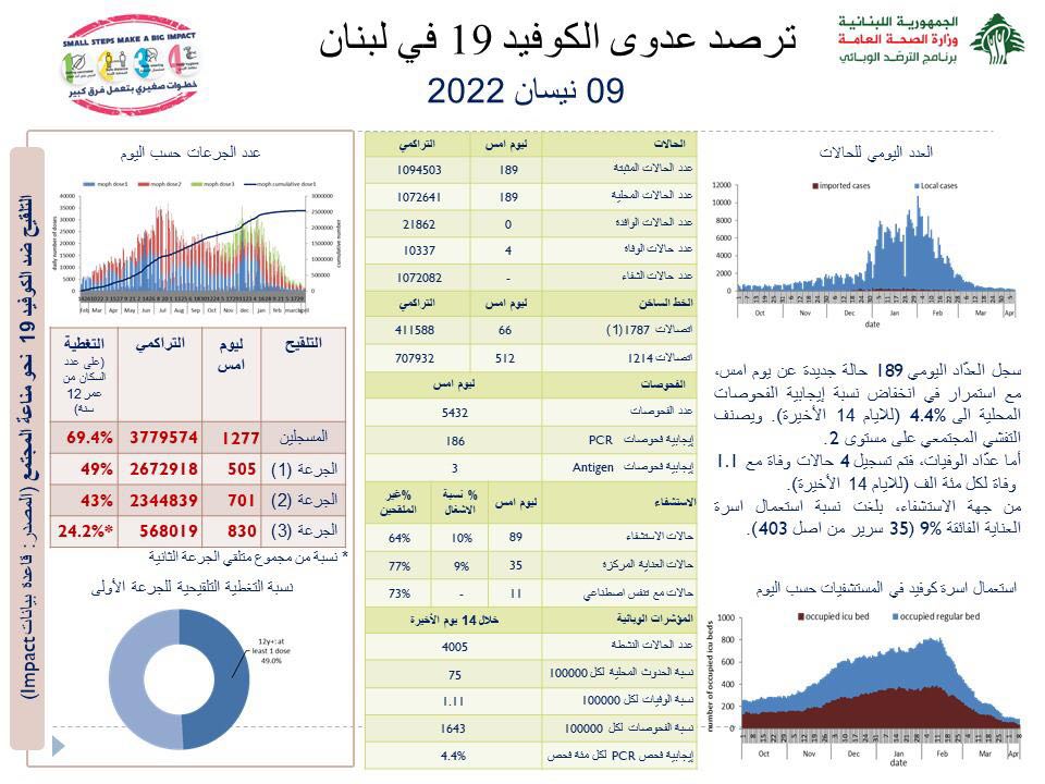 أعلنت وزارة الصحة العامّة في تقريرها اليومي حول مستجدات فيروس كورونا اليوم السبت, عن “تسجيل 189 إصابة جديدة بكورونا (189 محلية و0 وافدة) ليصبح العدد الإجمالي للإصابات 1094503”.