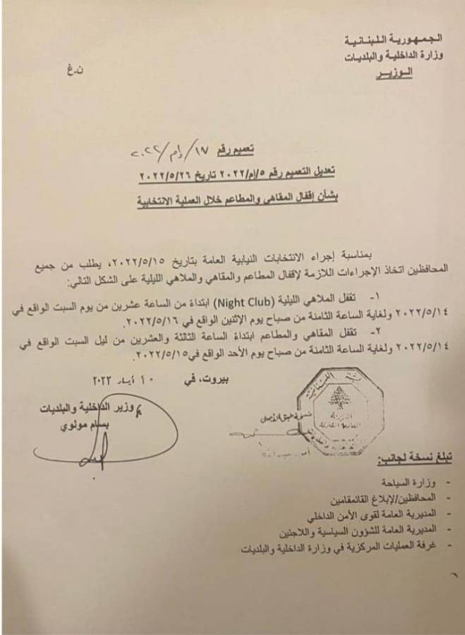 عطفاً على التعميم رقم 17/إم/2022 والقرار رقم 455 الصادرَين عن وزارة الداخلية والبلديات بتاريخ 10 نيسان 2022، بشأن إقفال الملاهي الليلية والمطاعم والمقاهي خلال العملية الانتخابية وبشأن وقف سير الدراجات النارية، عمّمت وزارة السياحة على المؤسسات السياحية المذكورة أعلاه ضرورة التقيد بتطبيق التعميم والقرار المرفقين ربطاً مع تكليف الشرطة السياحية ومصلحة الضابطة السياحية في وزارة السياحية تنفيذ مضمون هذا التعميم.