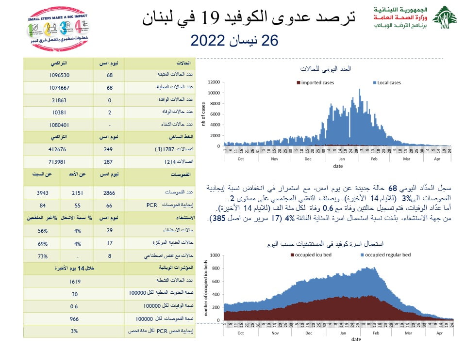 أعلنت وزارة الصحة العامّة في تقريرها اليومي حول مستجدات فيروس كورونا اليوم الثلاثاء, عن “تسجيل 68 إصابة جديدة بكورونا (68 محلية و0 وافدة) ليصبح العدد الإجمالي للإصابات 1096530”.