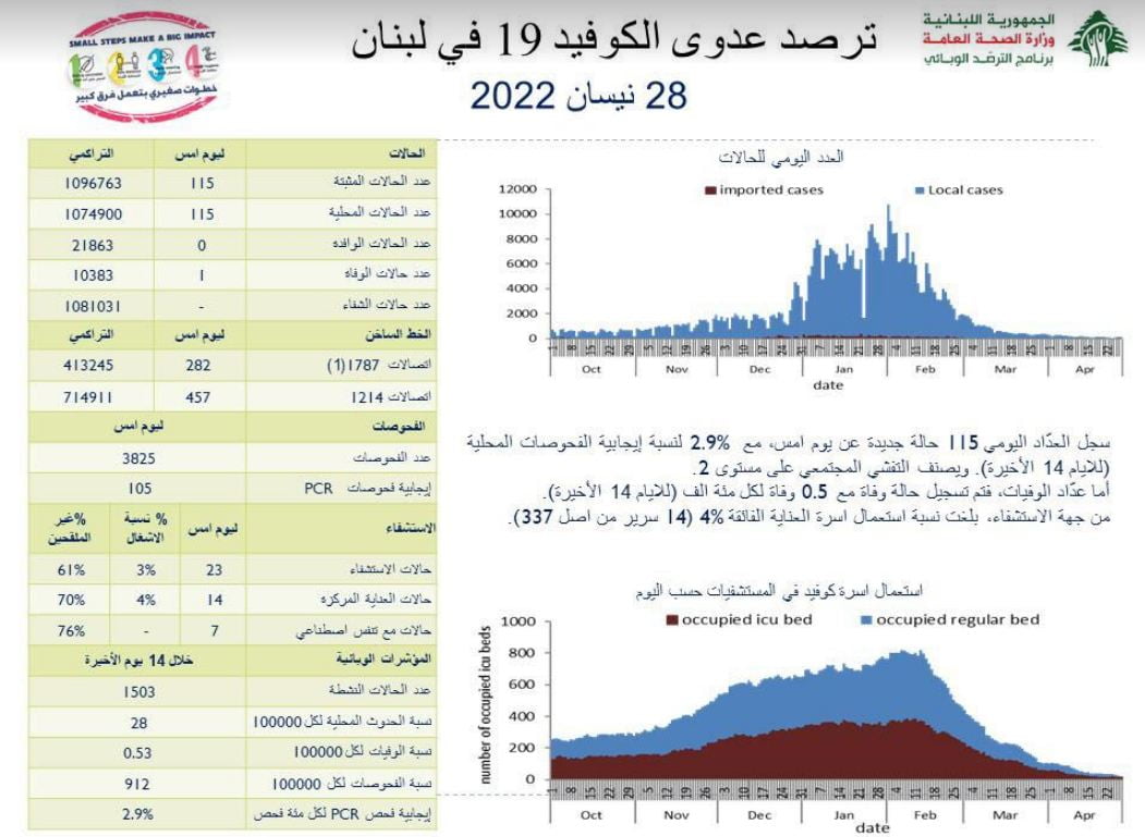 أعلنت وزارة الصحة العامّة في تقريرها اليومي حول مستجدات فيروس كورونا اليوم الخميس, عن “تسجيل 115 إصابة جديدة بكورونا (115 محلية و0 وافدة) ليصبح العدد الإجمالي للإصابات 1096763”.