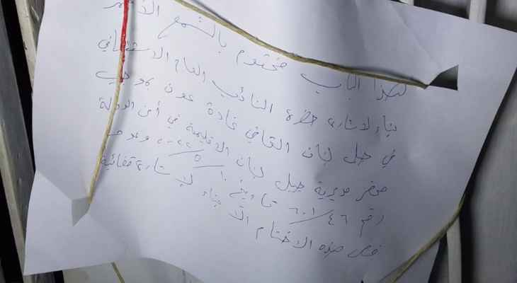 وجاء في ورقة الختم: “هذا الباب مختوم بالشمع الأحمر بناء لإشارة حضرة النائب الإستئنافي في جبل لبنان القاضي غادة عون بموجب محضر مديرية جبل لبنان الإقليمية في أمن الدولة رقم 601/46 تاريخ 10/5/2022 وعدم فض هذه الأختام الا بناء لإشارة قضائية”.