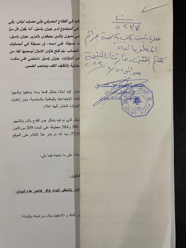 تقدم رئيس التيار الوطني الحر النائب جبران باسيل, اليوم الإثنين, عبر وكيله القانوني ماجد بويز، بإدعاء ضد رئيس تحرير صحيفة “الديار” الصحافي شارل أيوب، بجرم “القدح والذم والتحقير”.