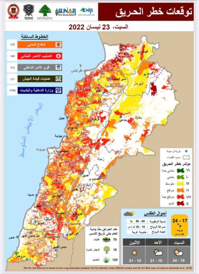 نشرت المديرية العامة للدفاع المدني نشرة احتمال حرائق الغابات والتي تظهر مدى ارتفاع خطر نشوب الحرائق تبعاً للمناطق.