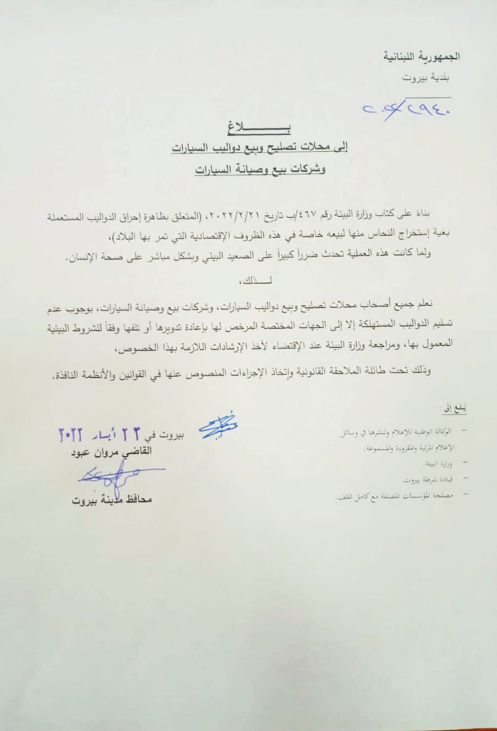 أصدر محافظ مدينة بيروت مروان عبود بلاغاً الى محال تصليح وبيع اطارات السيارات وشركات بيع وصيانة السيارات جاء فيه التالي: