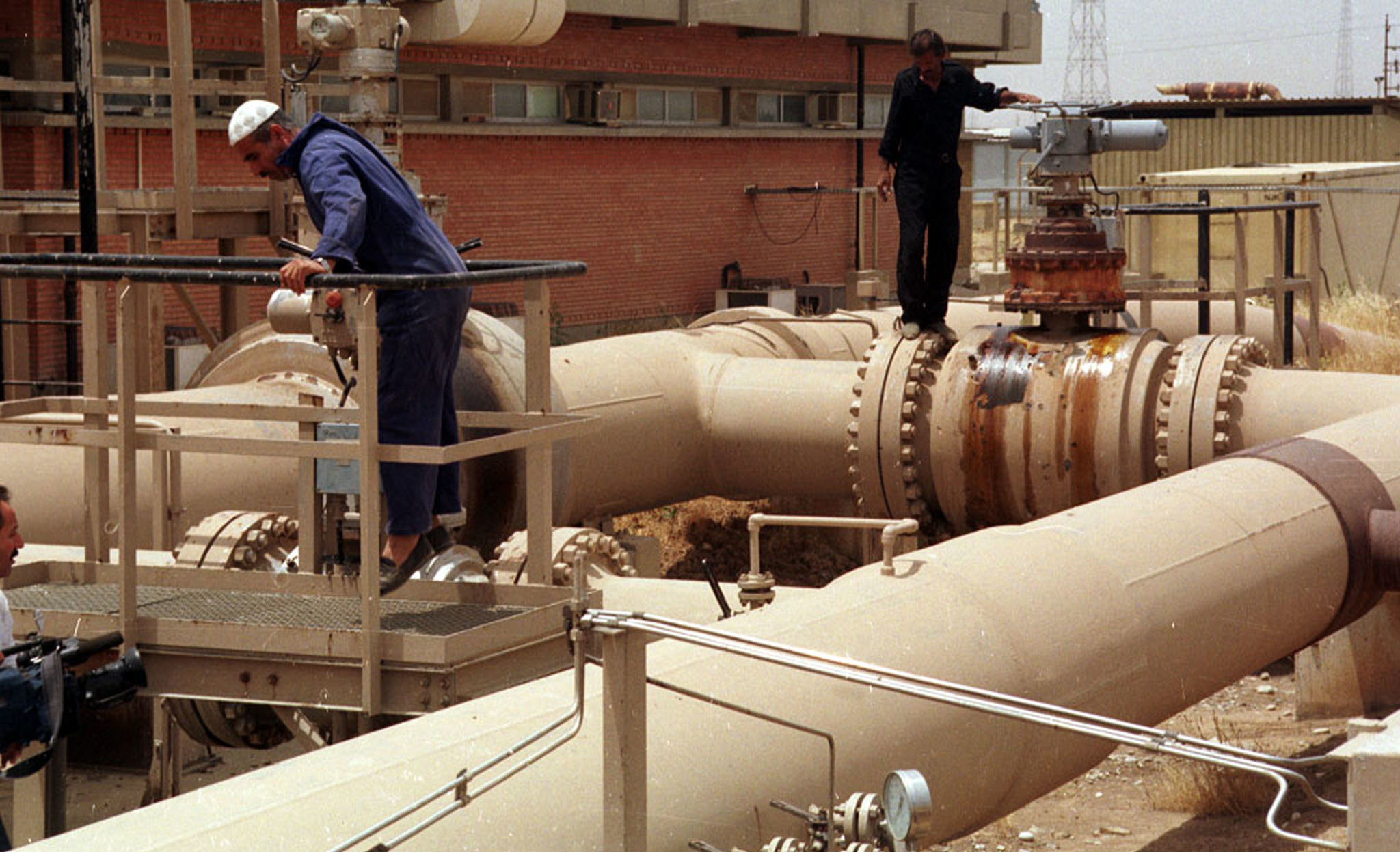 - FILE PHOTO 24MAY99 - Iraqi oil workers inspect pipelines at one of the oil refineries in the Kirkuk area in this May 24, 1999 file photo. [Iraq on Thursday accused Kuwait of drilling on the border to steal Iraqi oil saying it planned unspecified steps to stop the alleged theft. Energy analists and diplomats said on Friday that to make his point, Iraqi President Saddam Hussein only needs to shut off crude exports to send already high world oil prices through the roof and pile pressure on Western governments hit by fuel protests. Kuwait says the accusation was, and remains, nonsense.]