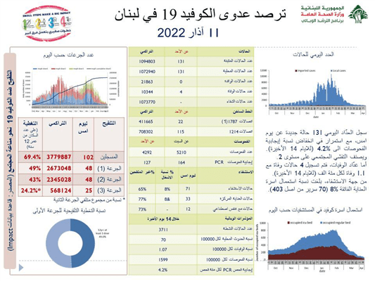 أعلنت وزارة الصحة العامة في تقريرها اليومي تسجيل 131 إصابة جديدة بفيروس كورونا رفعت العدد التراكمي للحالات المثبتة الى 1094803، كما تم تسجيل 4 حالات وفاة”.