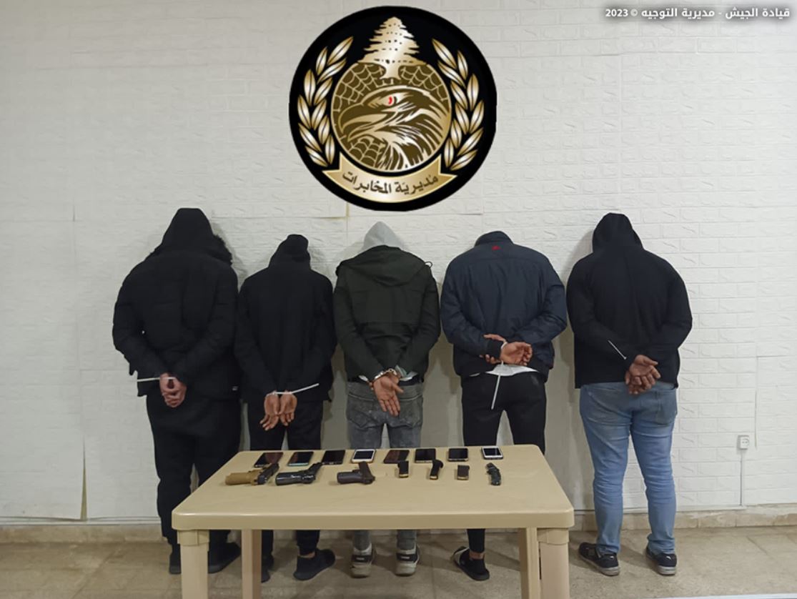 صدر عن قيادة الجيش مديرية التوجيه، بيانٌ جاء فيه, “بتاريخ 22 / 3 / 2023، وبعدما توافرت معلومات لدى مديرية المخابرات عن خطف المواطن (و.و.) بقوة السلاح في منطقة خلده بهدف الحصول على فدية مالية، أوقفت قوة من الجيش بالتنسيق مع المديرية المذكورة المواطنين (ع.ع.) و(ع.أ.) و(م.ص.) و(و.ع.) و(أ.ت.) في بلدة علمان – الشوف أثناء انتقالهم داخل سيارتين مع المواطن المخطوف، وضبطت في حوزتهم 3 مسدسات حربية”.