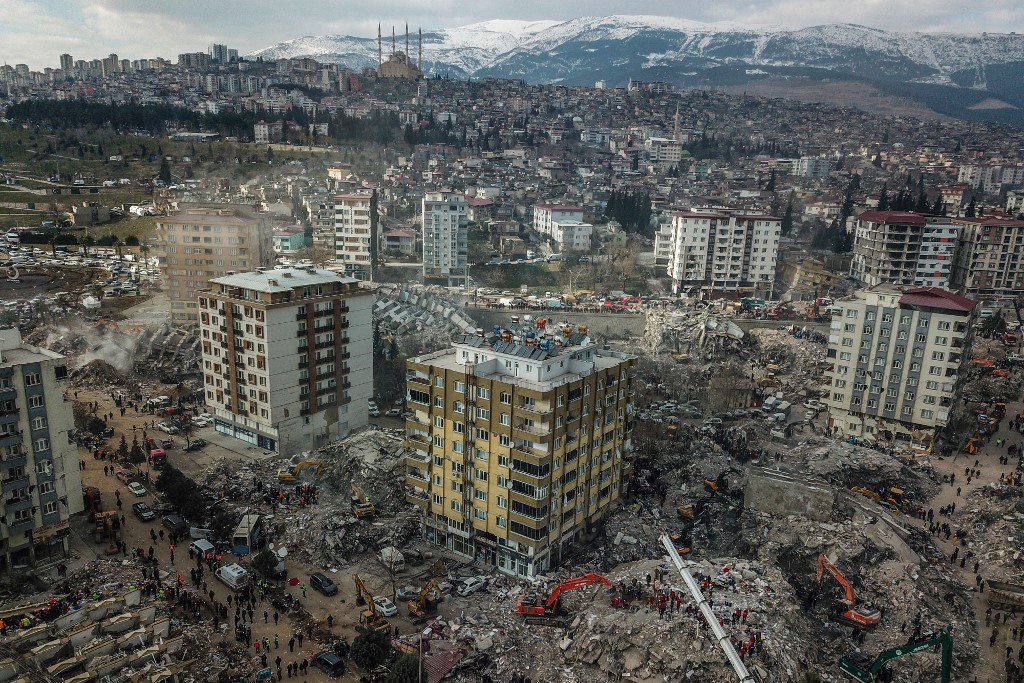 يُظهر هذا المنظر الجوي المباني المنهارة أثناء عملية الإنقاذ الجارية في كهرمان ماراس ، مركز الزلزال الأول الذي بلغت قوته 7.8 درجة قبل خمسة أيام ، في جنوب شرق تركيا