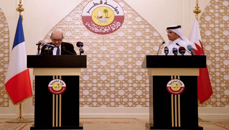 وقال وزير الخارجية القطرية في مؤتمر صحافي مشترك مع لودريان إن العلاقة التي تربط بلاده بفرنسا علاقة استراتيجية ومميزة في المجالات كافة، لافتاً إلى احتفال البلدين بمرور 50 عاماً على العلاقة الدبلوماسية بينهما.