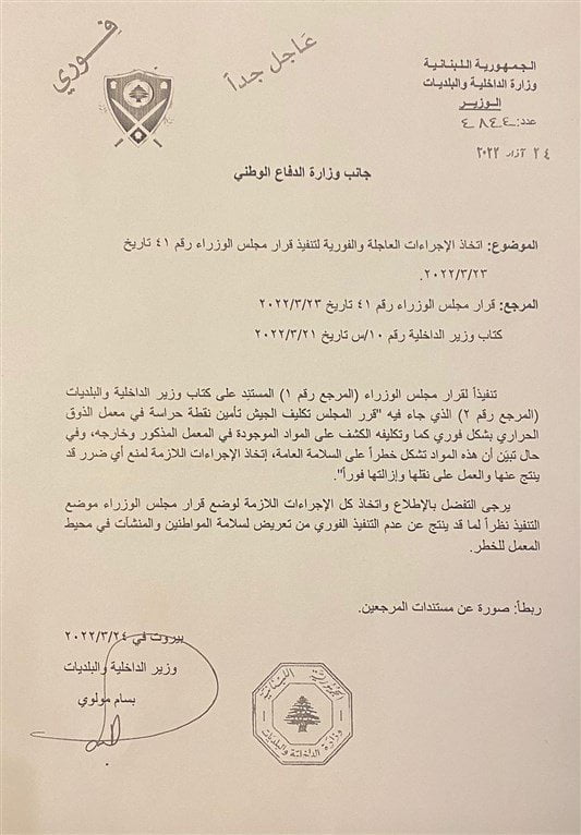 بناءً عليه، أرسل الوزير مولوي كتاباً إلى وزارة الدفاع الوطني يطلب فيه اتخاذ كل الاجراءات اللازمة لوضع قرار مجلس الوزراء موضع التنفيذ نظراً لما قد ينتج عن عدم التنفيذ الفوري من تعريض لسلامة المواطنين والمنشآت في محيط المعمل للخطر، هذا ويؤكد مولوي متابعته لهذه المسألة بشكل دقيق”.