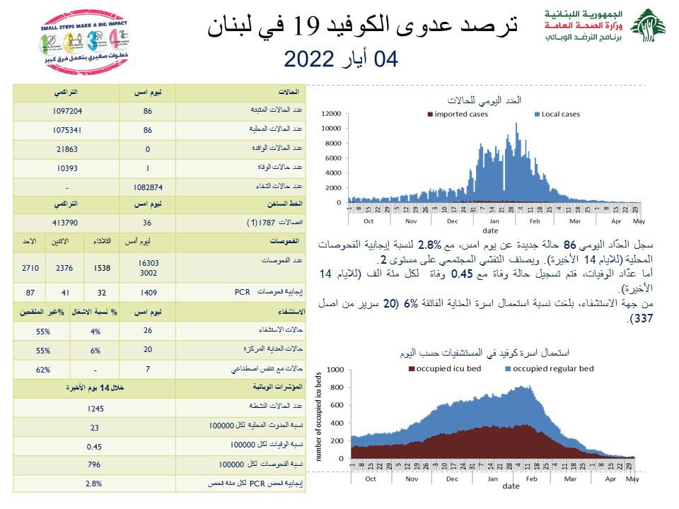 أعلنت وزارة الصحة العامّة في تقريرها اليومي حول مستجدات فيروس كورونا اليوم الأربعاء, عن “تسجيل 86 إصابة جديدة بكورونا (86 محلية و0 وافدة) ليصبح العدد الإجمالي للإصابات 1097204”.