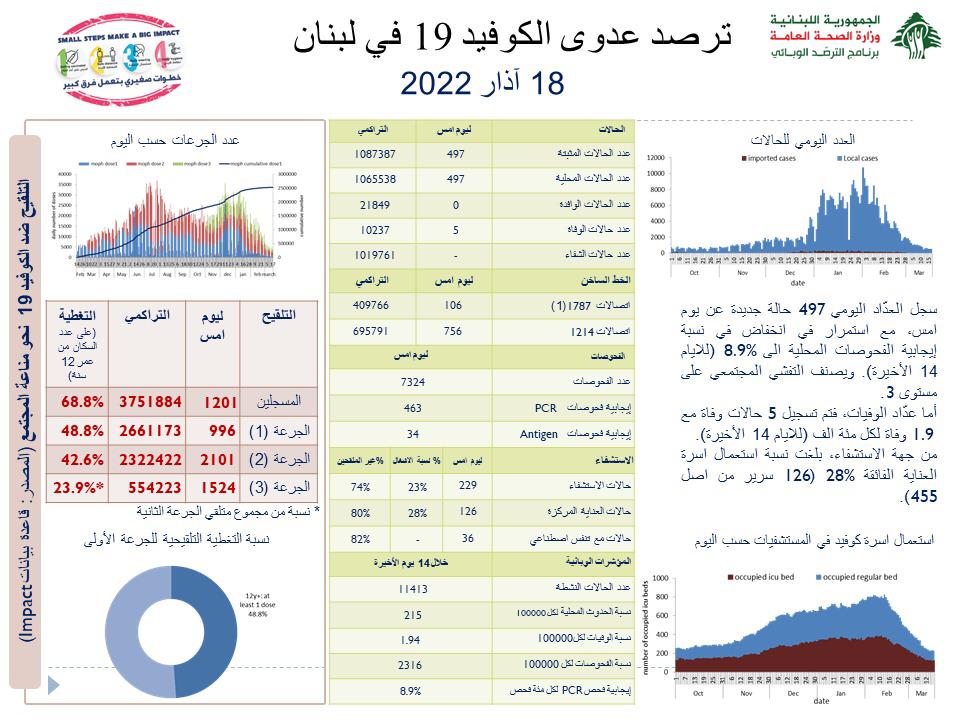 أعلنت وزارة الصحة العامّة في تقريرها اليومي حول مستجدات فيروس كورونا اليوم الجمعة, عن “تسجيل 497 إصابة جديدة بكورونا (497 محلية و0 وافدة) ليصبح العدد الإجمالي للإصابات 1087387”.