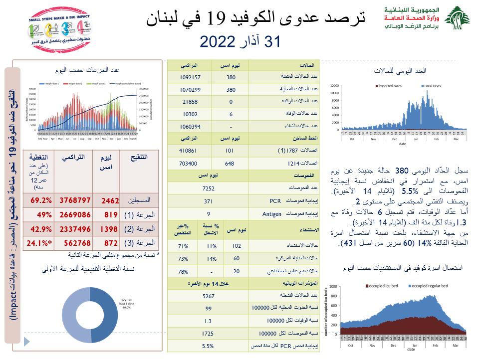 أعلنت وزارة الصحة العامّة في تقريرها اليومي حول مستجدات فيروس كورونا اليوم الخميس, عن “تسجيل 380 إصابة جديدة بكورونا (380 محلية و0 وافدة) ليصبح العدد الإجمالي للإصابات 1092157”.